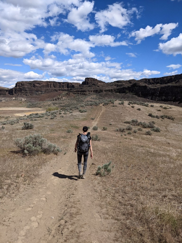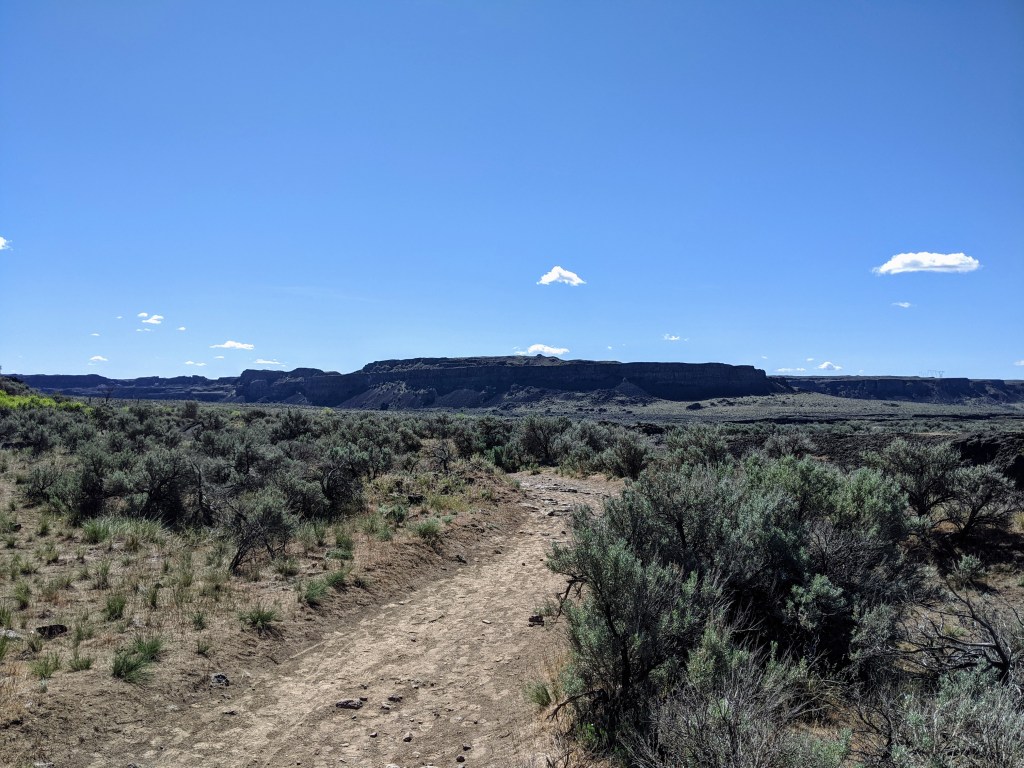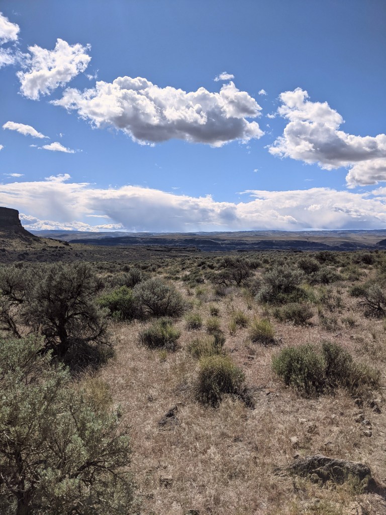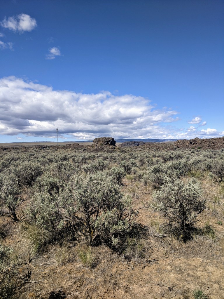 Upon entering the trail we were immediately surprised with a beautiful view. It was a desert-like area with fascinating bushes and beautiful basalt cliffs. I had never hiked anywhere like this before! It was a clear hot day with bright blue skies and puffy white clouds. It reminded me of a painting with how imperfect the clouds were.