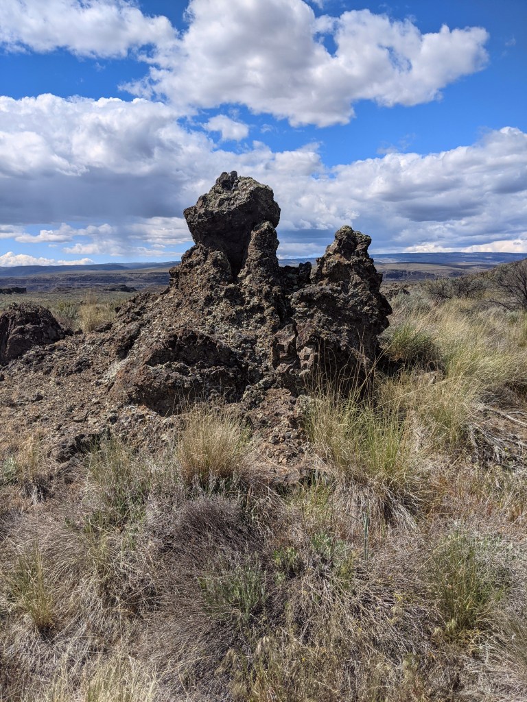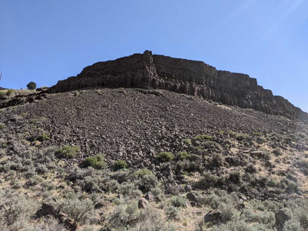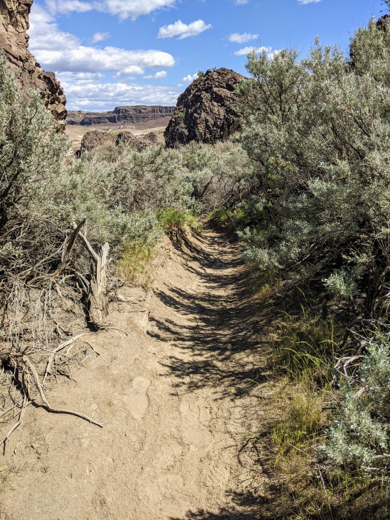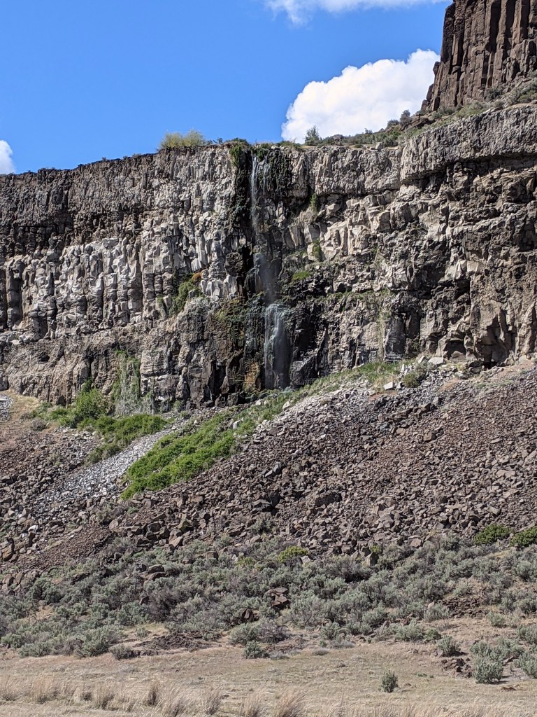 Upon entering the trail we were immediately surprised with a beautiful view. It was a desert-like area with fascinating bushes and beautiful basalt cliffs. I had never hiked anywhere like this before! It was a clear hot day with bright blue skies and puffy white clouds. It reminded me of a painting with how imperfect the clouds were.