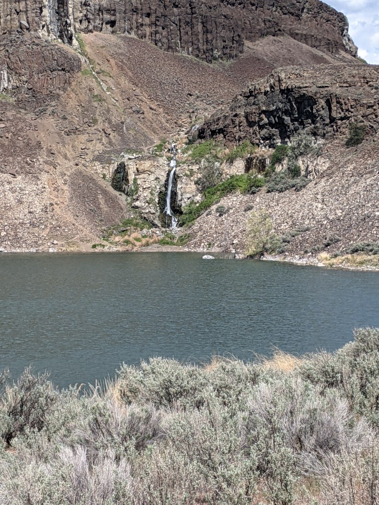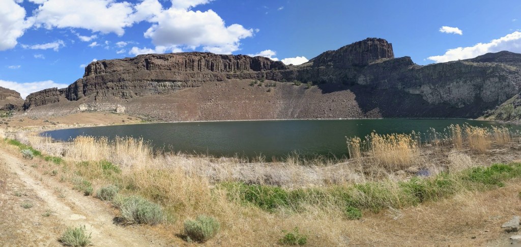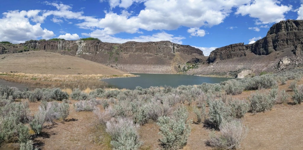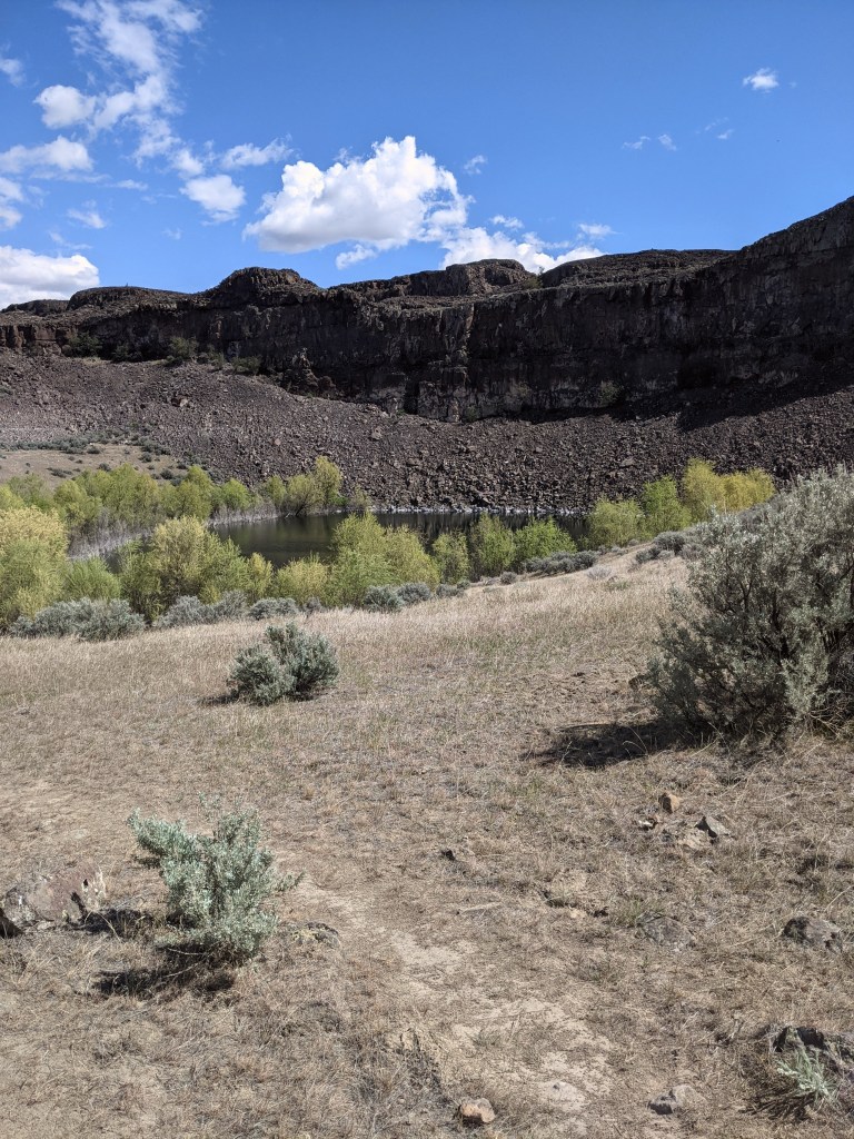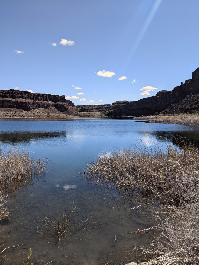 We had been hiking about 3 1/2 miles we hiked up a small hill when we were given the beautiful view of Dusty Lake. It was tucked into the far end of the valley (which I learned is also called a “coulee”) and it would be easy to miss if you didn’t know to look for it. With there not being much elevation gain on this trail, you are not able to see the lake until you are actually at it’s edge.