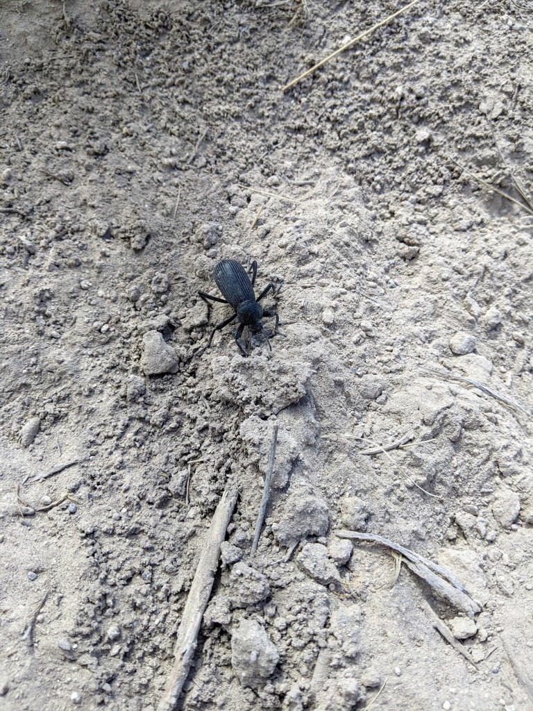 We wanted to enjoy this beautiful lake for a bit longer and decided to stop for lunch. I decided on tortilla soup (recipe is on the Trail Recipes page) while Paullena decided on teriyaki chicken and rice. We were greeted by a small lizard and a few ducks who were splashing around near the edge of the water, most like looking for lunch themselves. The lizard ran for the bush as it saw my shadow then stopped long enough for me to take a picture. I also found a cute little snake on the way to Dusty Lake that was soaking in a moment of warmth on the trail and not bothered by our presence, as well a large beetle that, at first, looked like a large spider. I believe the snake is a Western Racer.
